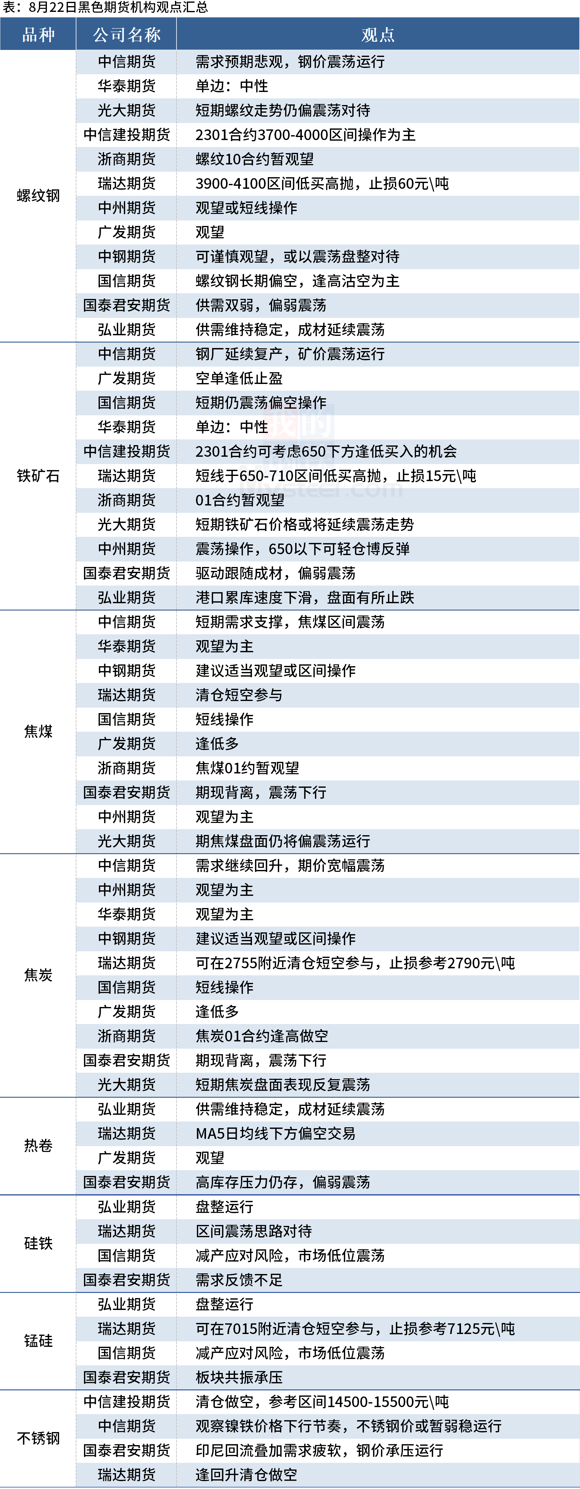 據(jù)Mysteel統(tǒng)計(jì)8月22日12家期貨機(jī)構(gòu)操作策略,其中多數(shù)機(jī)構(gòu)料螺紋鋼震蕩運(yùn)行,建議鐵礦石震蕩偏弱,焦煤、焦炭暫觀望。具體匯總內(nèi)容如下: