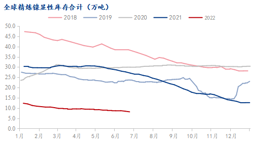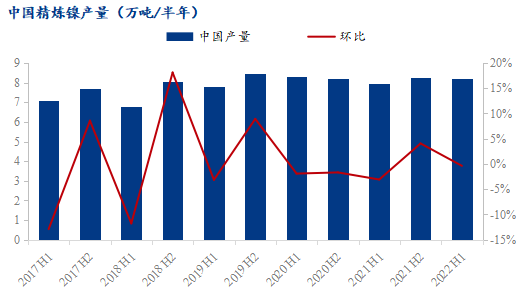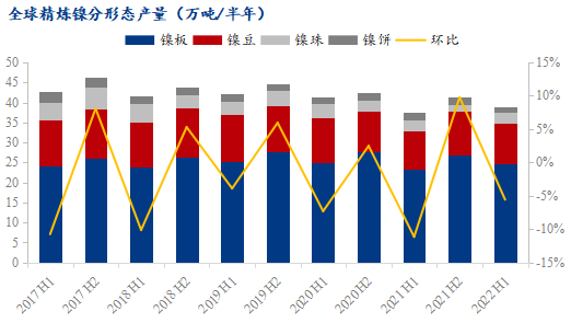 2022上半年,經歷地緣局勢沖突、鎳價巨幅波動、疫情持續(xù)、以及多家工廠設備檢修等事件,全球精煉鎳供應環(huán)比去年下半年有所減少,同比有小幅增漲。