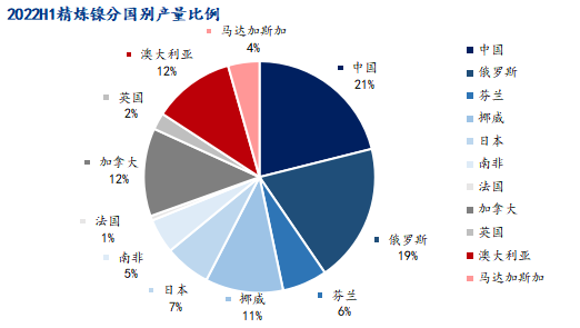 中國進口了大量低價中間品原料,精煉鎳生產有了較大提升,繼續(xù)占據(jù)世界精煉鎳第 一生產國的位置。俄羅斯修復了滲水的礦場,生產得到恢復,但由于國際局勢的動蕩,銷售和物流都遇到阻礙,切實供應至市場的量仍然有限。挪威在上半年受到行業(yè)罷工影響,產量出現(xiàn)較大下滑。澳大利亞鎳豆生產因工廠設備檢修而停產,同環(huán)比皆有明顯減少。加拿大的精煉鎳工廠同樣遇到設備維護問題,產量處于相對低位。法國的精煉鎳工廠所有權轉移,上半年多數(shù)時間處于整合期,產量較少。日本、南非、英國、馬達加斯加等國的精煉鎳生產則較為穩(wěn)定。