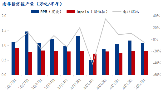 英美資源公司的RPM工廠主要產品為鎳板,2022上半年產量為1.08萬噸,環(huán)比減少7.69%,同比增加1.89%。