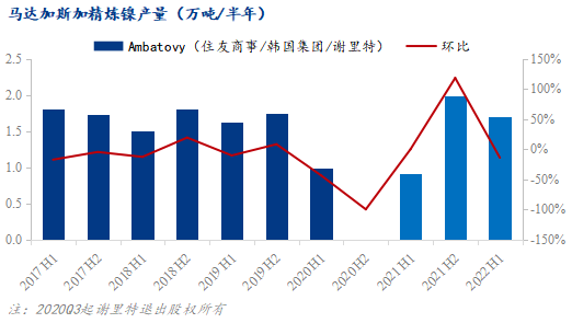 2022上半年Ambatovy的鎳豆產量1.71萬噸,環(huán)比減少14.07%,同比增加87.91%,同比大幅的增量主要由于2021年一季度工廠因疫情影響仍處停運當中,至二季度方始復產,導致同比前值較低,上半年中國自馬達加斯加進口鎳豆1.01萬噸。
