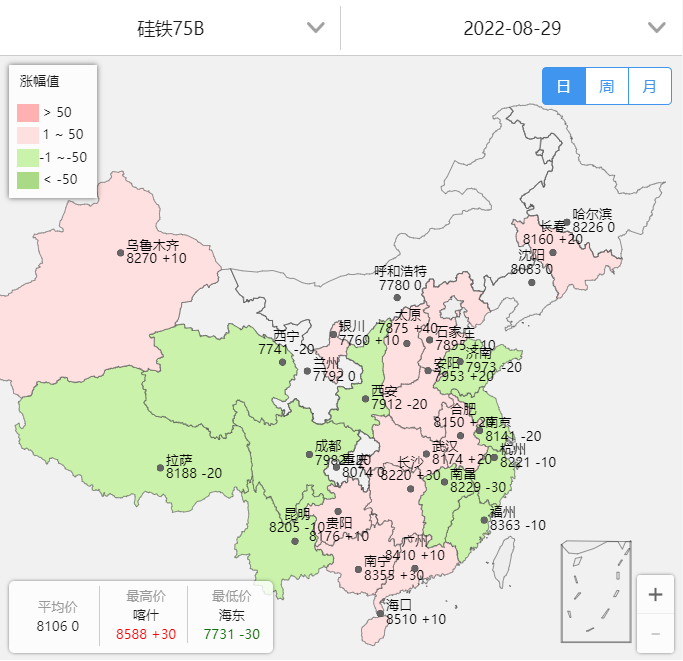 周初歸來,硅鐵市場保持維穩(wěn)運行為主,期貨盤面因上周連續(xù)回升之后,今日價格便高開低走,現(xiàn)盤面zui高8208點,zui低7910點,市場心態(tài)相對平靜看待。再而陜西神木區(qū)域管控持續(xù),廠家表示物流貨車憑核酸可以進出,但車輛減少,多數(shù)司機不愿前往,府谷無明顯影響,現(xiàn)由于神木疫情導致原煤價格上調,蘭炭價格上漲。短期來看,若市場無消息面刺激影響下硅鐵市場或將呈維穩(wěn)運行為主,且針對后期走勢來看,后市仍需關注期貨盤面進一步走勢情況以及市場實際成交情況。zui新數(shù)據(jù)顯示:今日硅鐵72#市場價格較上一個交易日來看價格暫無明顯波動,業(yè)內人士謹慎觀望為主,今日硅鐵主流報價在7600-7800元/噸附近。另,合金寶指數(shù)顯示,今日硅鐵75B價格較上一交易日來看呈小幅震蕩趨勢運行,其中,河南、河北、山東、江蘇等地現(xiàn)金含稅包到價格集中在7953-8141元/噸附近,具體如下圖所示: