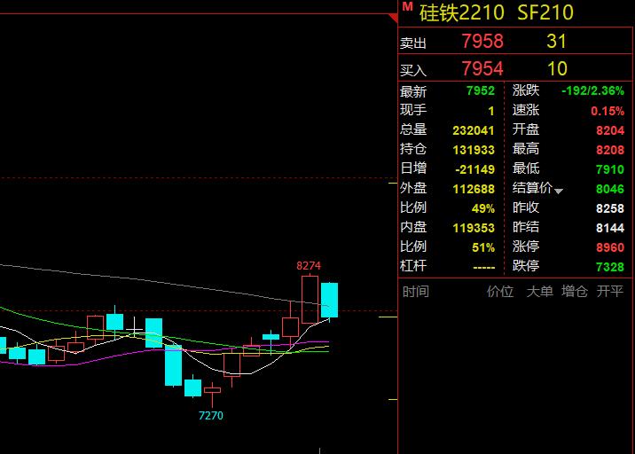期貨市場:今日硅鐵期貨主力2210合約上演低開低走行情,盤中zui高8208點,zui低7910點,當日減倉21149手,總持倉131933手,成交量較上一交易日微微減少,盤面錄得一根略帶影線的陰K線。上周五我們已經(jīng)說到,雖然近期終端需求有轉好預期,但盤面在出現(xiàn)較大升水后產(chǎn)業(yè)套保需求較大,而周末再次傳出美聯(lián)儲加息預期,市場受挫大幅下行。從技術上看,今日技術性回調尚未結束,操作上建議逢反彈短線做空,并做好止盈止損。(僅供參考)